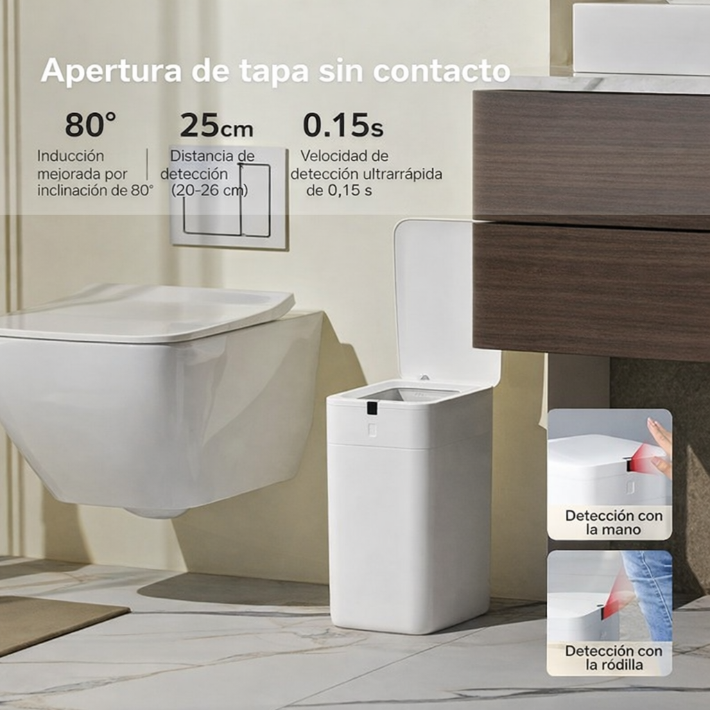 La tapa se abre automáticamente al mover la mano o acercarse ligeramente al sensor. Esto permite tirar la basura sin tocar el basurero y ayuda a evitar superficies sucias y malos olores.