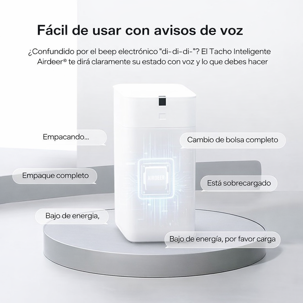El basurero incluye indicaciones por voz que facilitan su uso para todos los miembros de la familia, incluidos niños y adultos mayores.
