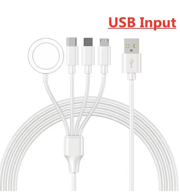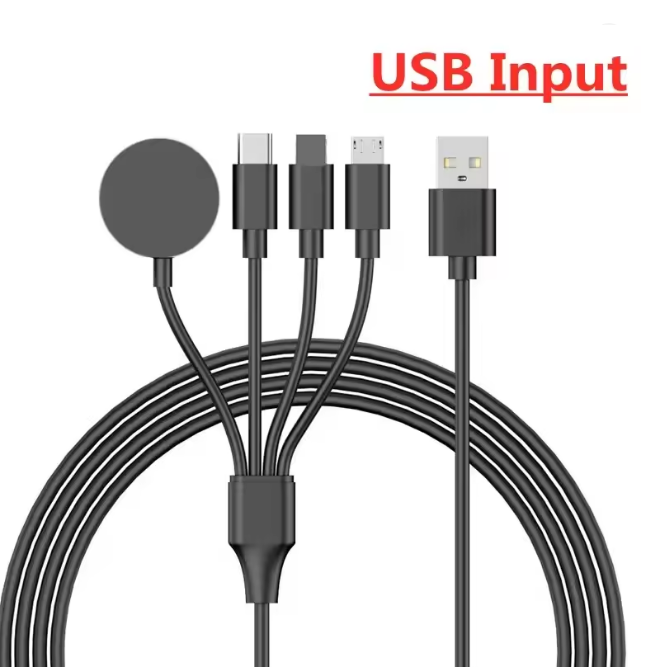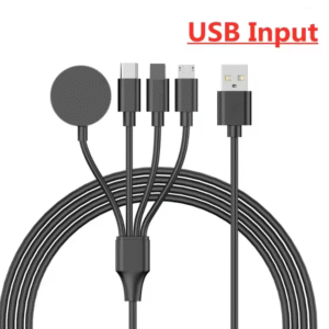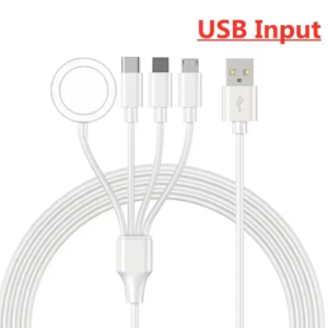Este cable 4 en 1 integra conexiones USB-C, Lightning y Micro-USB, siendo compatible con iPhone, teléfonos Android y otros dispositivos. Además, incluye un módulo de carga inalámbrica magnética, diseñado especialmente para Apple Watch. Con soporte para carga rápida, es fácil de transportar y permite cargar varios dispositivos con un solo cable, ideal para viajes, oficina o el hogar.