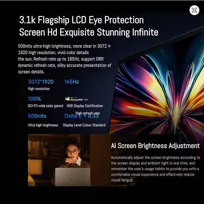 500nits ultra-high brightness, more clear in 3072 x1920 high resolution, vivid color detailsthe sun. Refresh rate up to 165Hz, support DRR